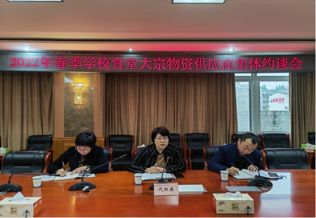 “民以食为天、食以安为先”,为切实加强食品安全管理,严控学校食品安全风险,3月30日上午,后勤管理处在行政楼第二会议室组织召开了2022年春季学校食品安全会暨食堂大宗物资食材供应商集体约谈会。党委委员、副院长代红英、后勤管理处处长翟向东、副处长林涛、各食堂经理、食品安全员、保管员及部分办公室人员参加会议,会议由翟向东主持。