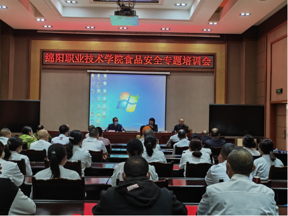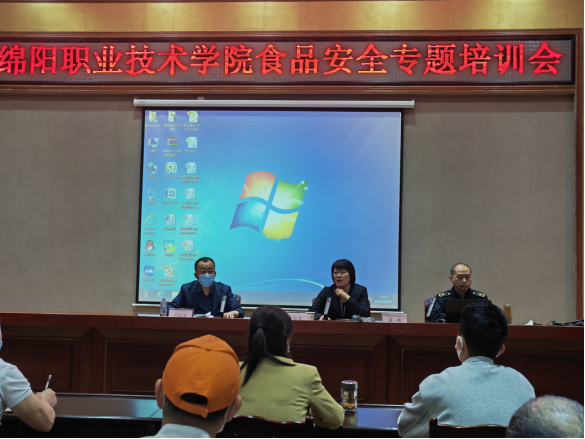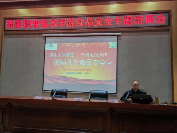 为进一步加强校园食品安全管理,强化食品从业人员的主体责任意识,筑牢食品安全防线, 10月17日下午,后勤管理处特邀绵阳市市场监督管理局餐饮服务安全监管科科长蒋伟在行政楼第一会议室开展了以“落实主体责任,严格规范操作,保障师生食品安全”为主题的食品安全专题培训会。后勤管理处处长、商业中心负责人、饮食中心办公室人员、食堂从业人员、校内商业及餐饮网点负责人参加,会议由副校长代红英主持。